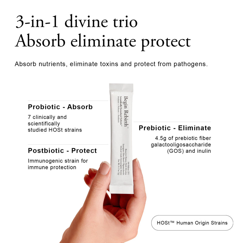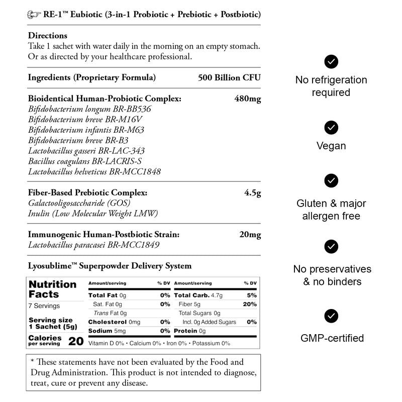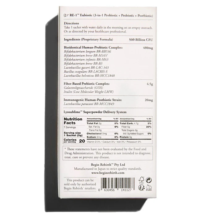 Begin Rebirth RE-1™ represents a new category in microbiome supplementation: medical-grade eubiotics. Unlike standard probiotics, RE-1™ combines bioidentical human-strain probiotics, fiber-based prebiotics, and immunogenic postbiotics in a single, scientifically advanced formula.